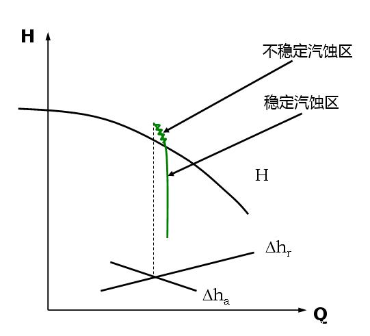 当有效汽蚀Δha降到低于必需汽蚀余量Δhr时,产生噪音、振动、压头明显降低,称不稳定汽蚀区。