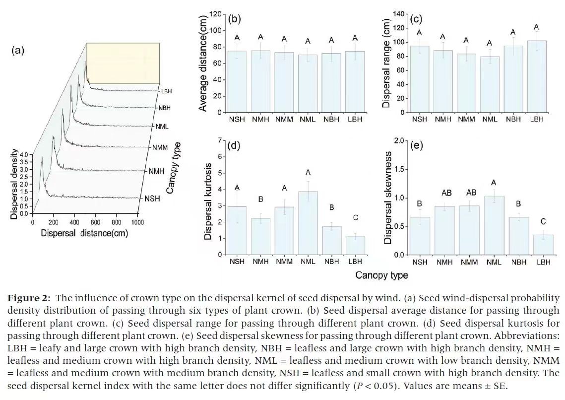 植株冠层会影响种子传播过程,明确植株冠层类型对种子传播核的影响,对于预测物种分布至关重要。本文通过风洞实验研究了29种不同传播体属性(附属物类型、质量、投影面积、形状指数、翼负荷和沉降速度)的植物种子在不同风速(2、4和6 m s−1)下通过不同冠层类型(根据冠幅大小、枝条密度和有叶或无叶片进行分类)的种子传播分布情况。研究发现,在低风速条件下,植物冠层类型对种子传播的峰度和偏度有显著影响,但对平均传播距离和范围无显著影响,随着风速的增加,冠层对传播峰度和偏度的影响减弱。虽然植物冠层对种子平均传播距离无显著影响,但它改变了种子传播核的形状。因此,尽管种子通过不同冠层时的传播范围相对不变,但其传播密度却存在显著差异。上述研究结果有助于理解植物集合种群动态,并强调了在种子传播研究中考虑冠层结构的重要性。