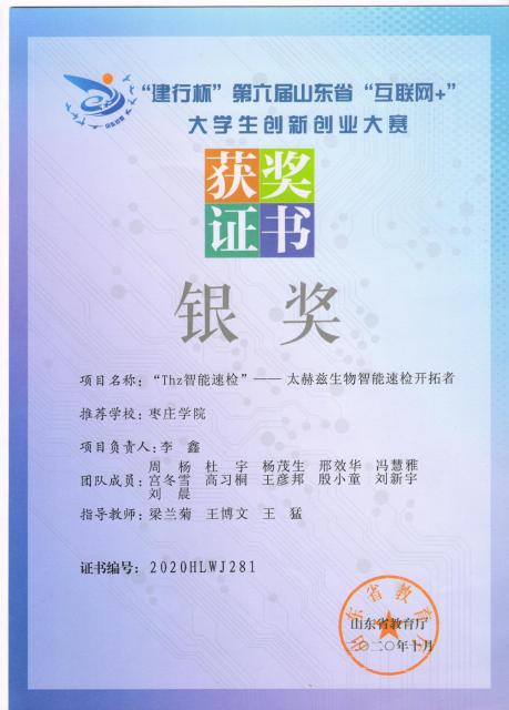 图5 2020年学生参加第六届山东省“互联网+”大学生创新创业大赛获银奖